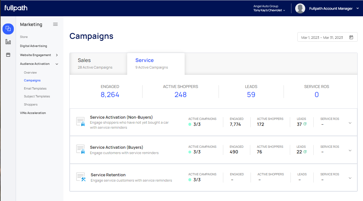 Fullpath supports several campaign types, each with different goals and audiences. The Service Activation campaign enables dealers to leverage their customer sales data as well as their non-buyer data for targeted email engagement around service reminders and offerings with the goal of activating their customers in the dealership service lane.