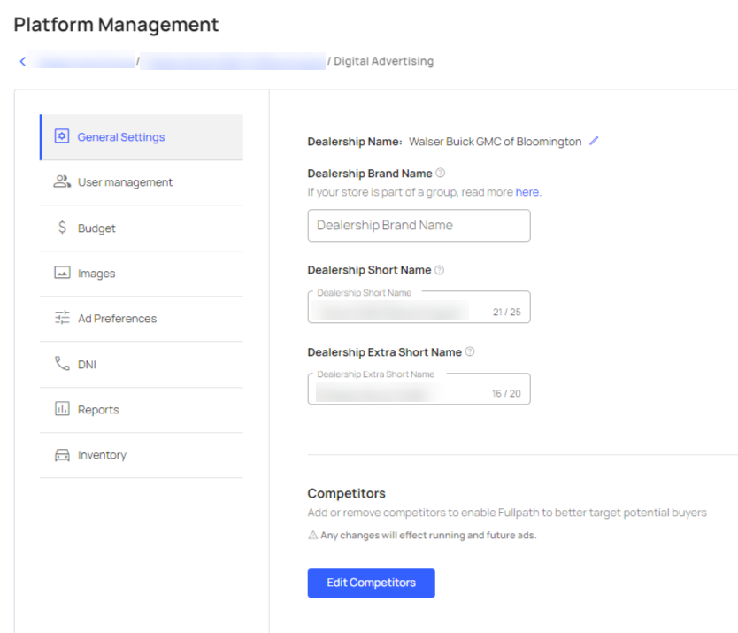 Setting up the Dealership name, shortened name, and in some cases, extra short name take place inside the Digital Advertising General Settings.