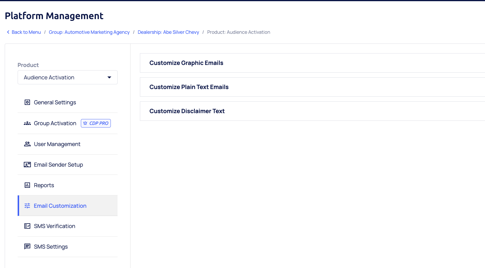The Email customizations section for Audience Activation (AA) is where you can configure and customize emails and layouts.