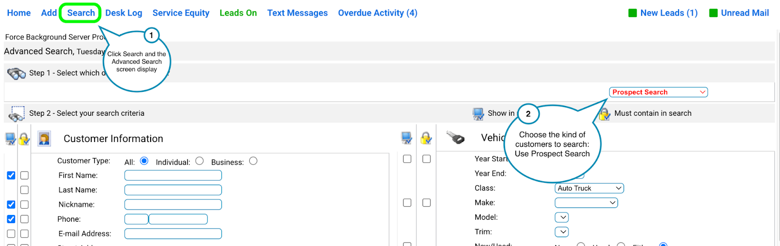 - In outer most selection menu bar beneath computer icons - select all field checkboxes in all 4 sections: Customer Information, Vehicle Wanted, Vehicle Traded, Opportunity Information