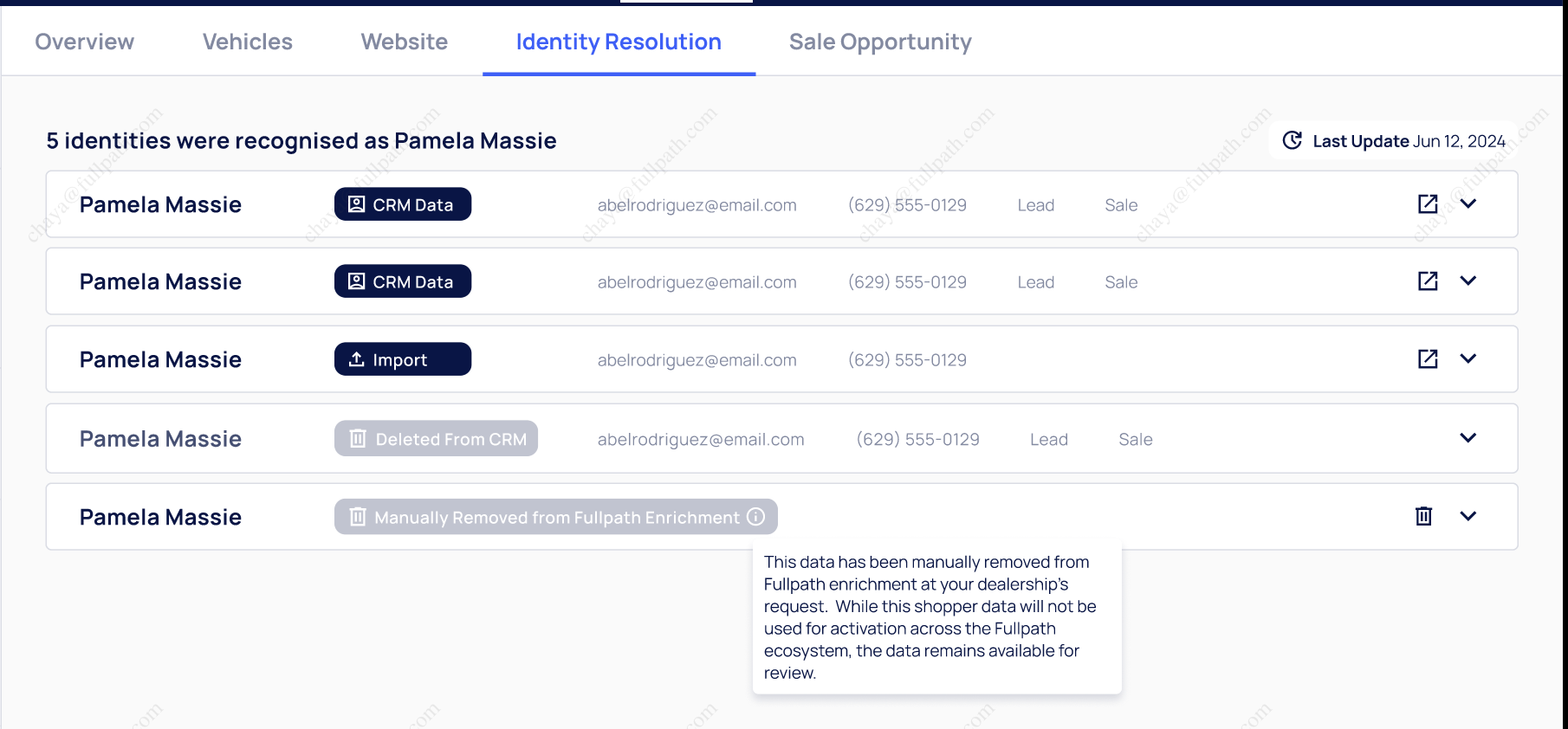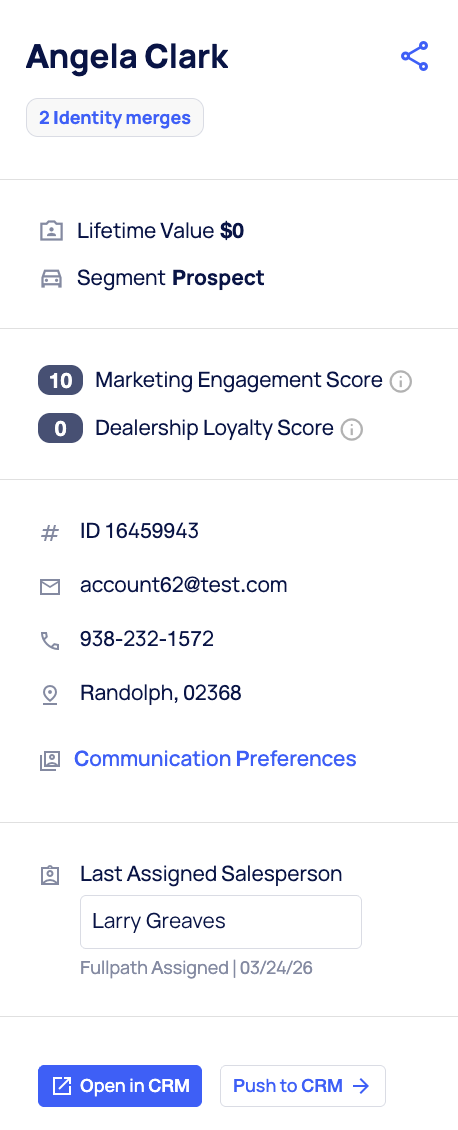 This could happen when shoppers convert using the same number but a different email, when spouses shop together, etc. The Fullpath CDP can detect and merge these entities into one in order to show you the most relevant information about the shopper journey (Note: we do not merge or take actions or manipulate any data inside the Dealership CRM).