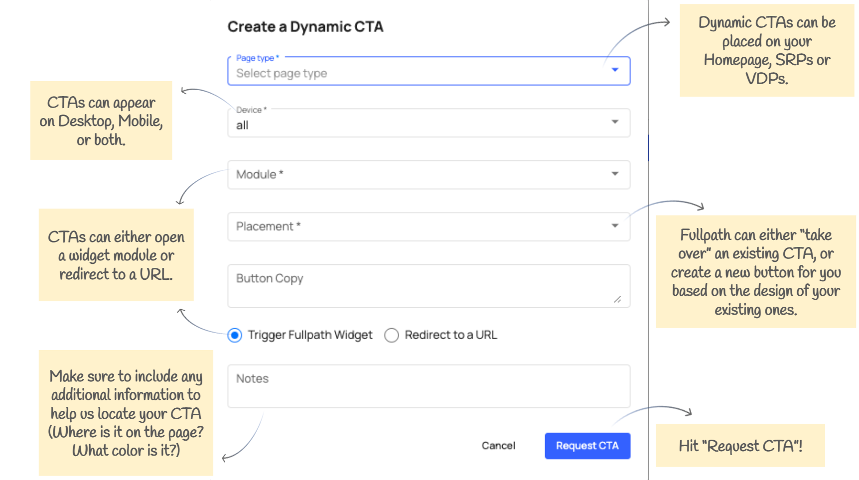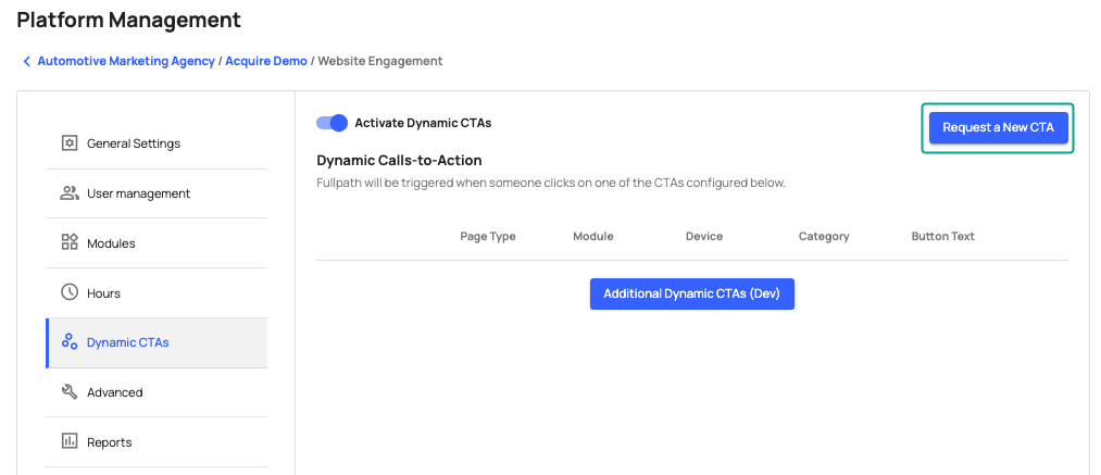 You can request a new Dynamic CTA within the Website Engagement settings in the Fullpath Dashboard. Fill out the necessary information and the Fullpath Technical Support team will receive your request and notify you when it is completed.