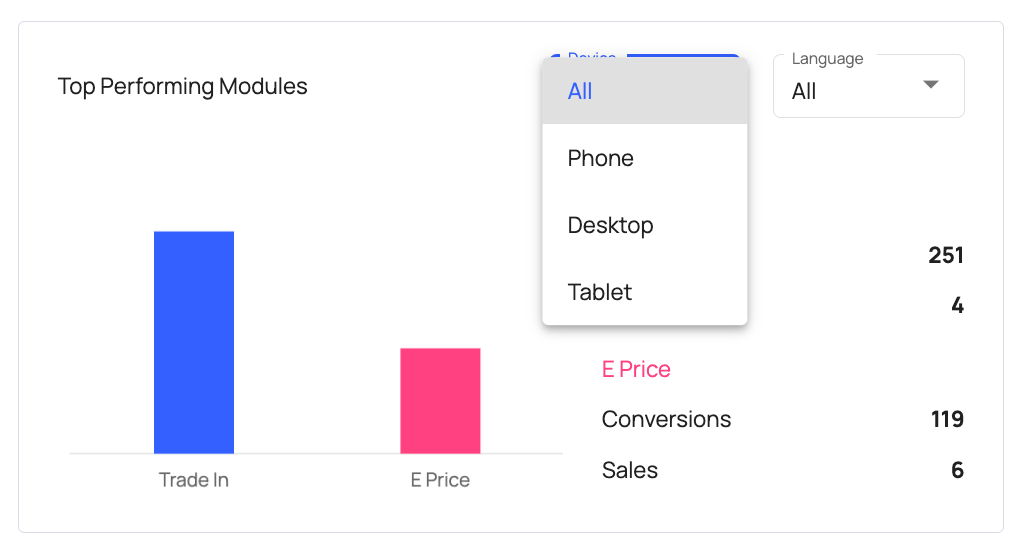 Each of these reporting blocks can be further broken down by device or language. The devices and languages displayed represent your website's top 3 devices and languages: