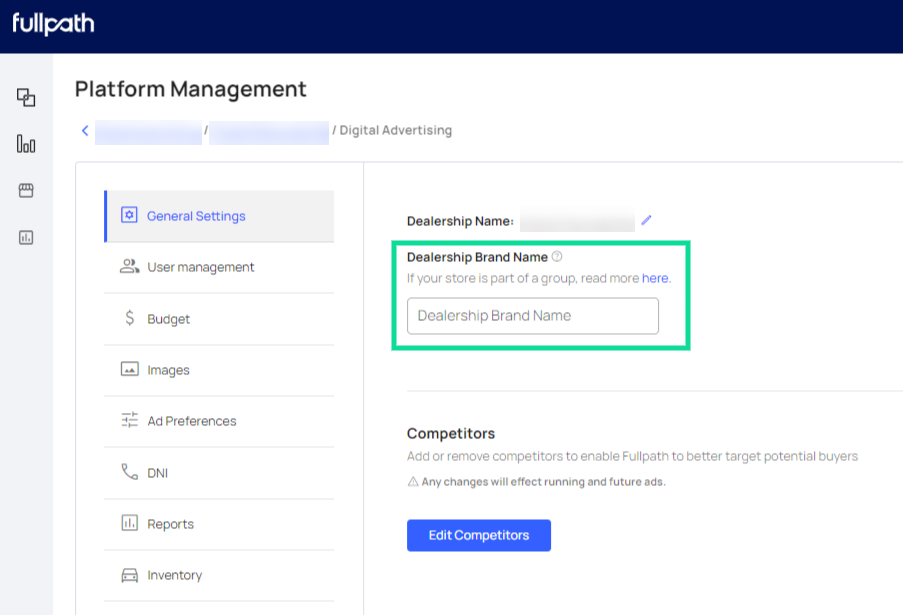 Digital Advertising settings give the opportunity for each store to add a “Dealership Group Name.” This enables the store to target brand-related keywords for the group.