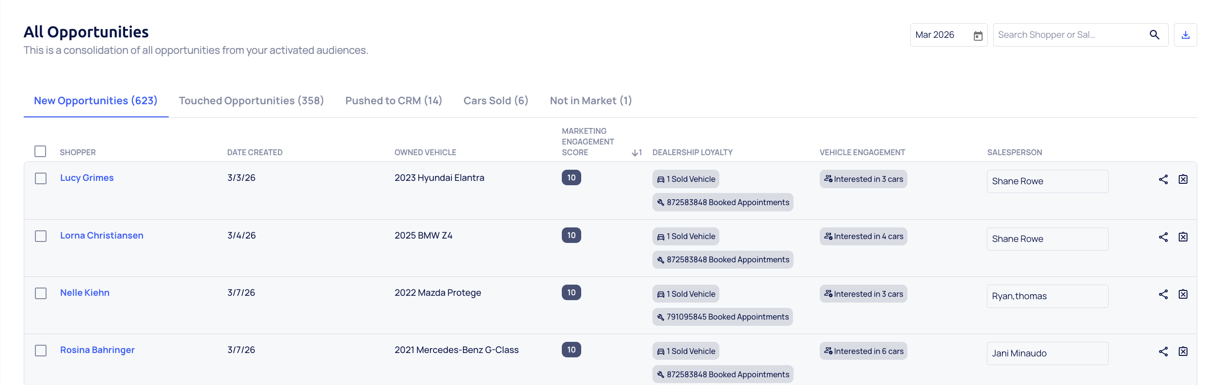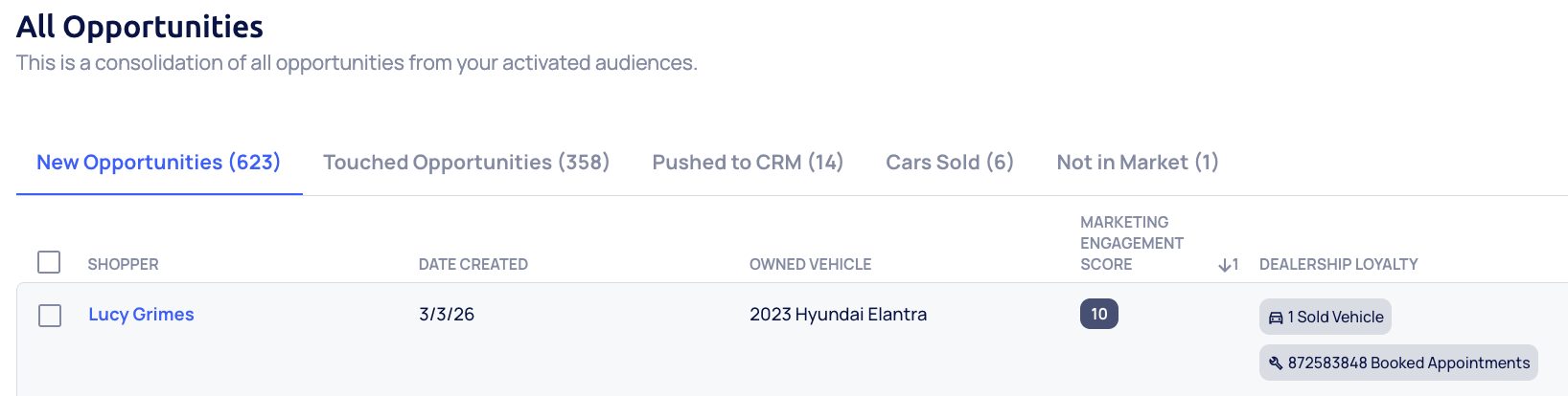 - New Opportunity: Identified by Data Ups and not yet touched by dealership staff.