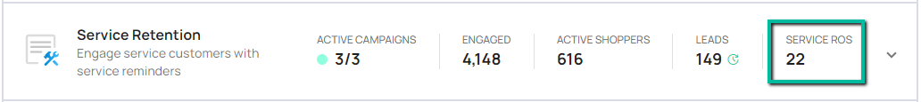For Service-related campaigns, the row will include a metric called Service ROs which displays the number of Service Repair Orders pulled from the CRM during the selected date: