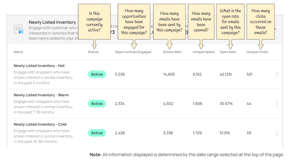 Important to note: Sales attributed to a campaign during the selected date range are not the aggregated total. Therefore, the total number of sales attributed to a particular campaign may not be visible within the default 30 day date range, and you should consider expanding and viewing a wider date range to get the full picture of sales which can be attributed to Audience Activation as vehicle sales cycles may sometimes take longer than 30 days. In addition: the leads and sales attributed to a campaign are incremental. This is important because it helps understand why the total number of leads and/or sales from all campaigns will NOT equal the total you see on the Overview page (which aggregates all incremental leads and sales). A customer may be in multiple campaigns at the same time. They may convert on one campaign but have their vehicle sale tied to another. The campaign performance will reflect this and list the same action twice - once inside each relevant campaign. This is not to inflate numbers, rather it is to show that several campaigns engaged customers, converted customers, or lead to a sale. |