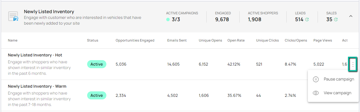 At the end of each campaign row is a ⋮ symbol which allows you to either pause the campaign or view the campaign. Each campaign has an expanded page which provides more in-depth performance stats as well as other actions you may take on a campaign.