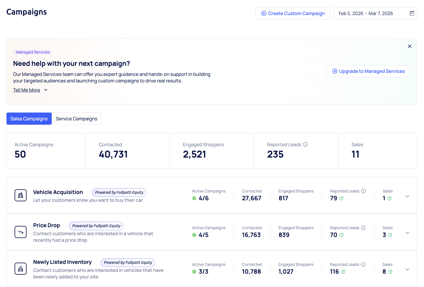 Fullpath's Audience Activation supports several types of campaigns that each engage different customer types across the shopper and re-engagement funnel. These campaigns engage around both Sales and Service related offers, incentives, and reminders.