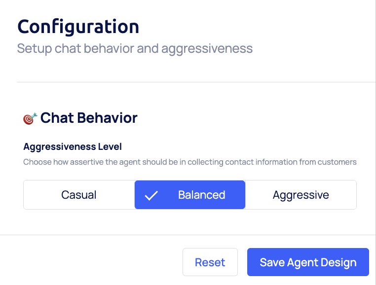 Defines how assertive the agent is when collecting contact information from customers. Choose the approach that best fits your customer engagement strategy:- Casual: Minimal prompts to collect contact data.