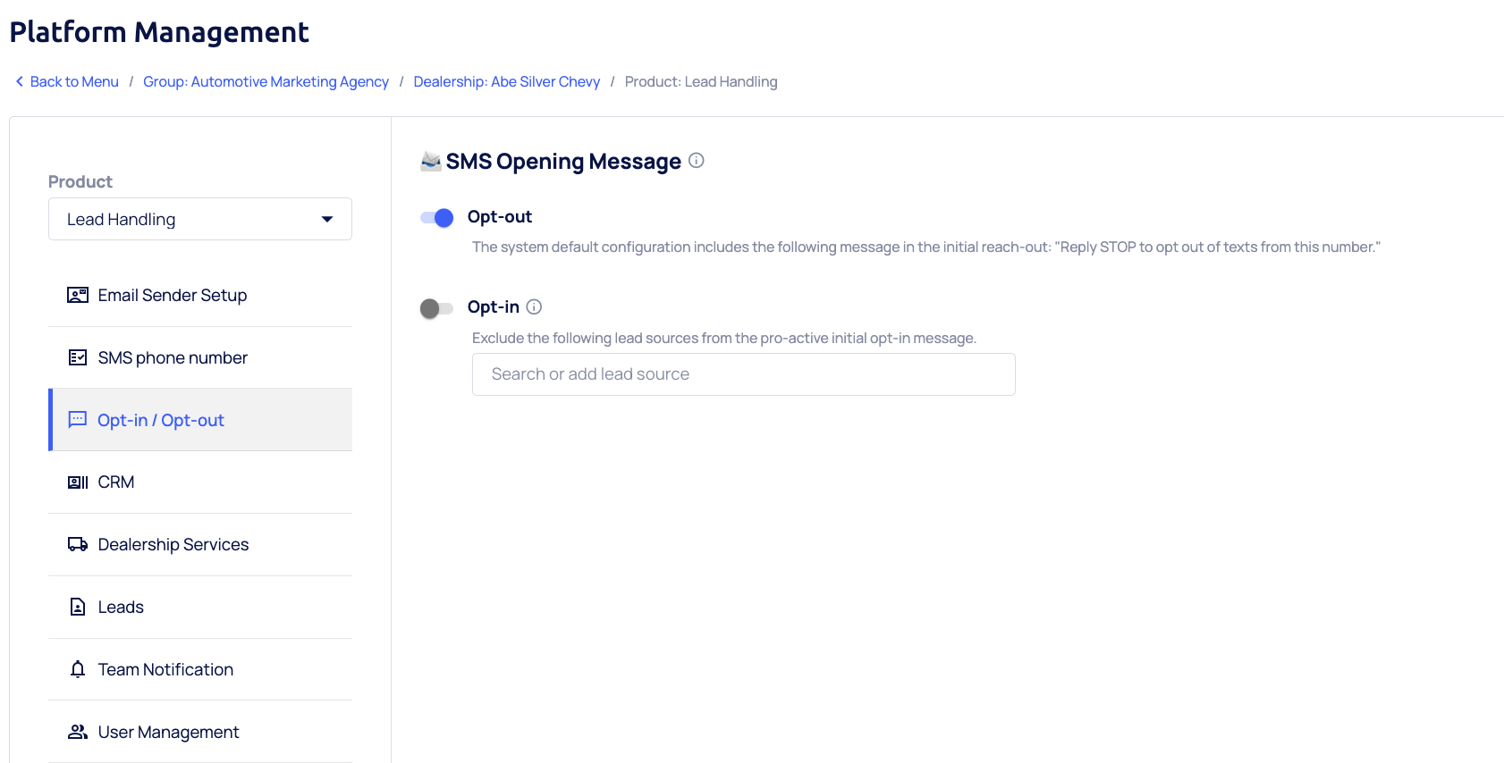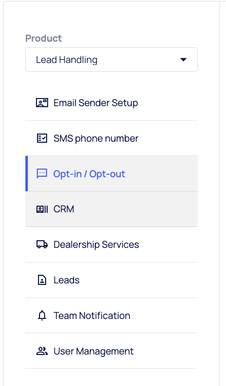 The new Opt-in / Opt-Out settings page in the Lead Handling product allows dealerships to configure SMS communication preferences that dictate how the Lead Handling Agent initiates contact with new leads. This page enables Dealers to choose whether the Agent should send a stringent opt-in message requiring consent before texting or begin with a standard message containing an opt-out option.